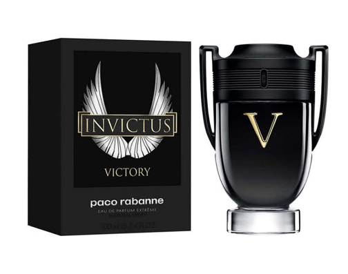 Invictus Victory Paco Rabanne EDP – Perfume oriental com notas de pimenta rosa e limão, coração de lavanda e incenso, e base de fava tonka e âmbar.